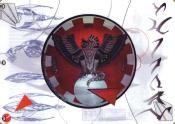 Front cover design consists of the stylized dragon Peacekeeper seal, as seen in "Into The Lion's Den". Four landscape-orientation blueprints pages consist of top, front, side, and back views of Talyn. Both the front cover and blueprint pages are printed on translucent white plastic in red, black, and grey. Back cover is clear plastic with a matte finish. All pages, and both covers, have rounded corners. Document is fastened along the left edge by three silver rivets. Overall dimensions are approximately 11 3/4" by 8 1/4". Each page (and the front cover) is marked with the copyright text: © 2002 The Jim Henson Company, © Hallmark Entertainment. JIM HENSON, FARSCAPE, characters and elements are trademarks of the Jim Henson Company. All rights reserved. |